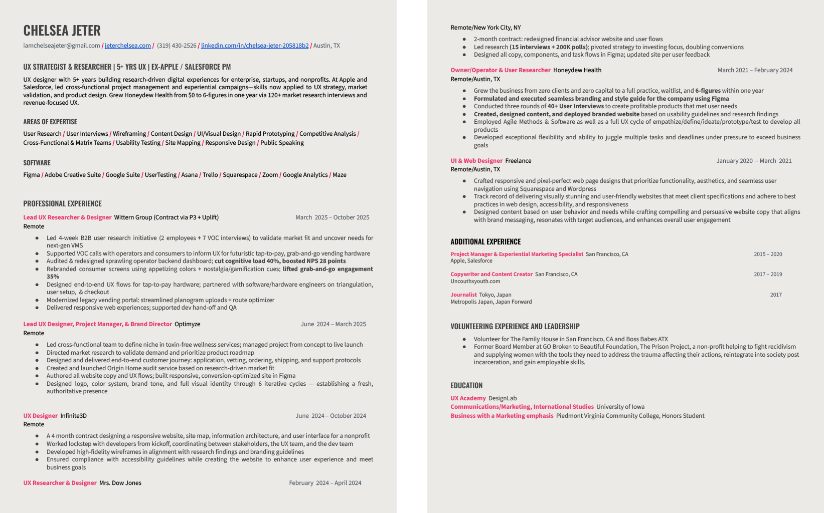 My background as a professional photographer, stylist, business owner (who scaled from $0 to six figures in year one through insight-driven iteration), and project manager in experiential marketing has sharpened my ability to see the full picture: human needs, visual storytelling, flawless execution, and cross-functional alignment. This foundation, paired with hands-on work at matrixed giants like Apple and Salesforce, equips me to effortlessly bridge user empathy with stakeholder priorities—delivering research and designs that are both human-centered and strategically sound.