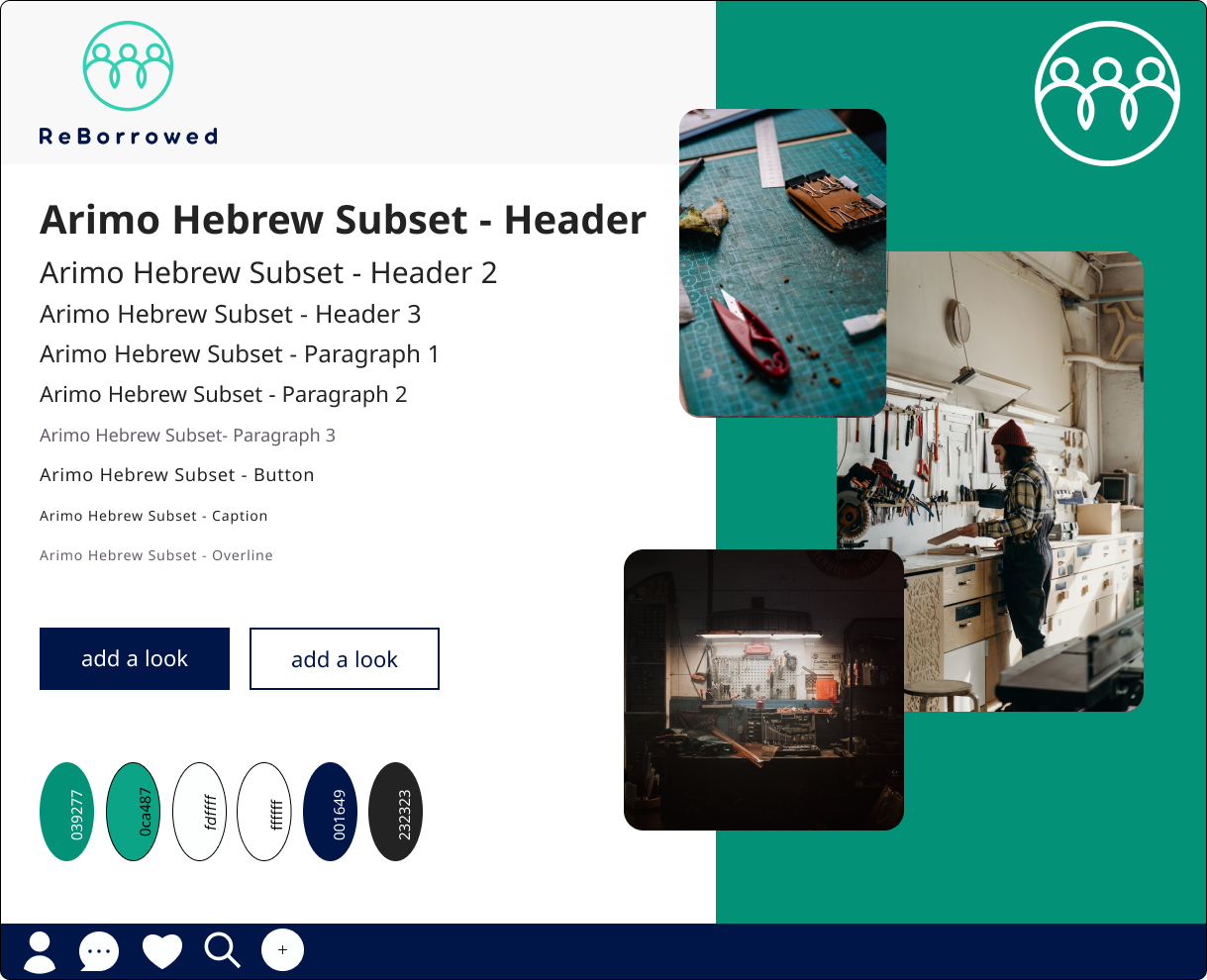 I built a style guide that encompassed ReBorrowed’s modern aesthetic accented with an inviting teal, the blue/green being reminiscent of sustainable messaging, pairing it with a logo that accented togetherness and community.